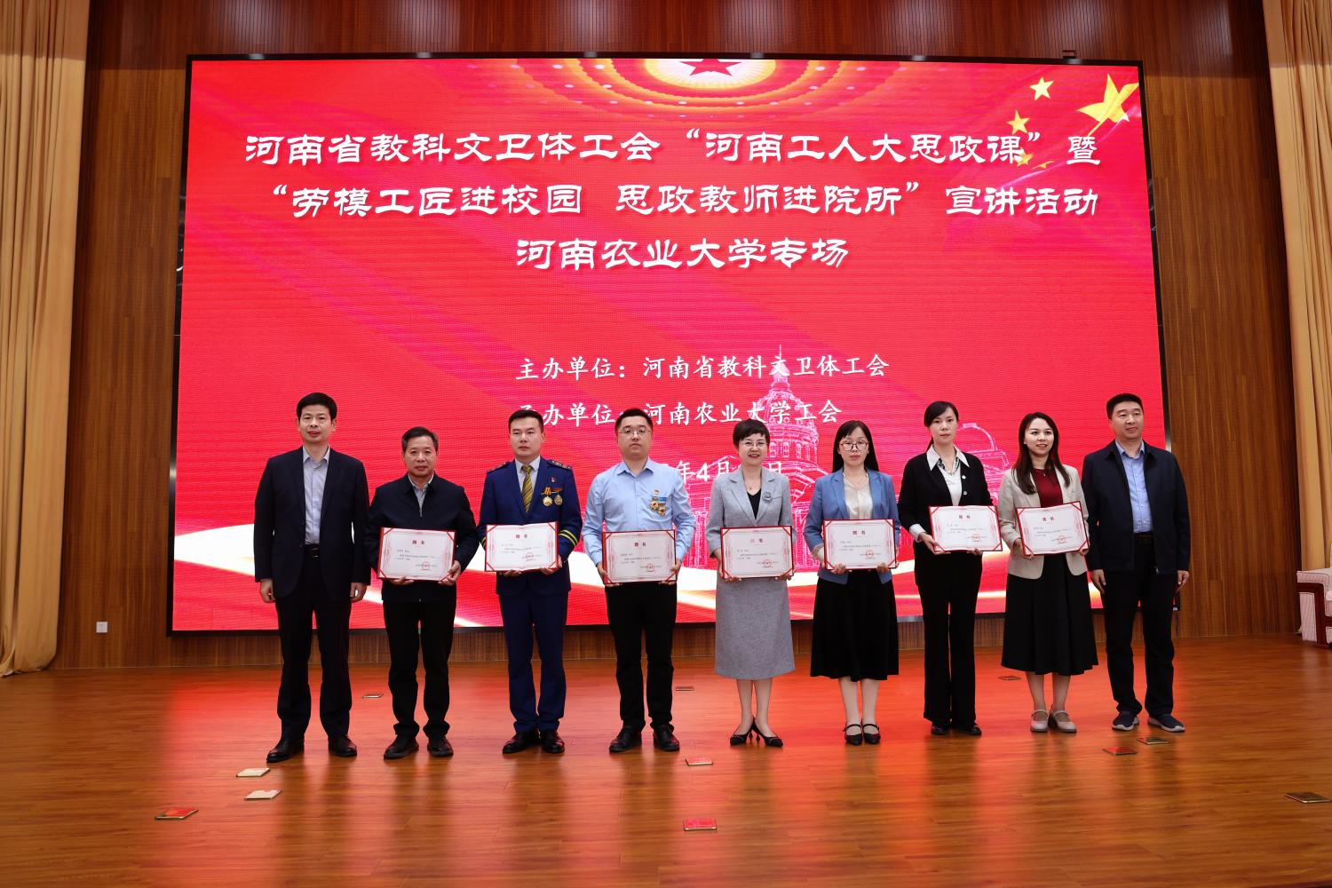 (通讯员:王雷松)4月15日,河南省教科文卫体工会“河南工人大思政课”暨“劳模工匠进校园 思政教师进院所”宣讲活动在情侣性爱视频 首场开讲。情侣性爱视频 陈娱教授、王雷松教授受聘河南省教科文卫体系统“河南工人大思政课”名师。