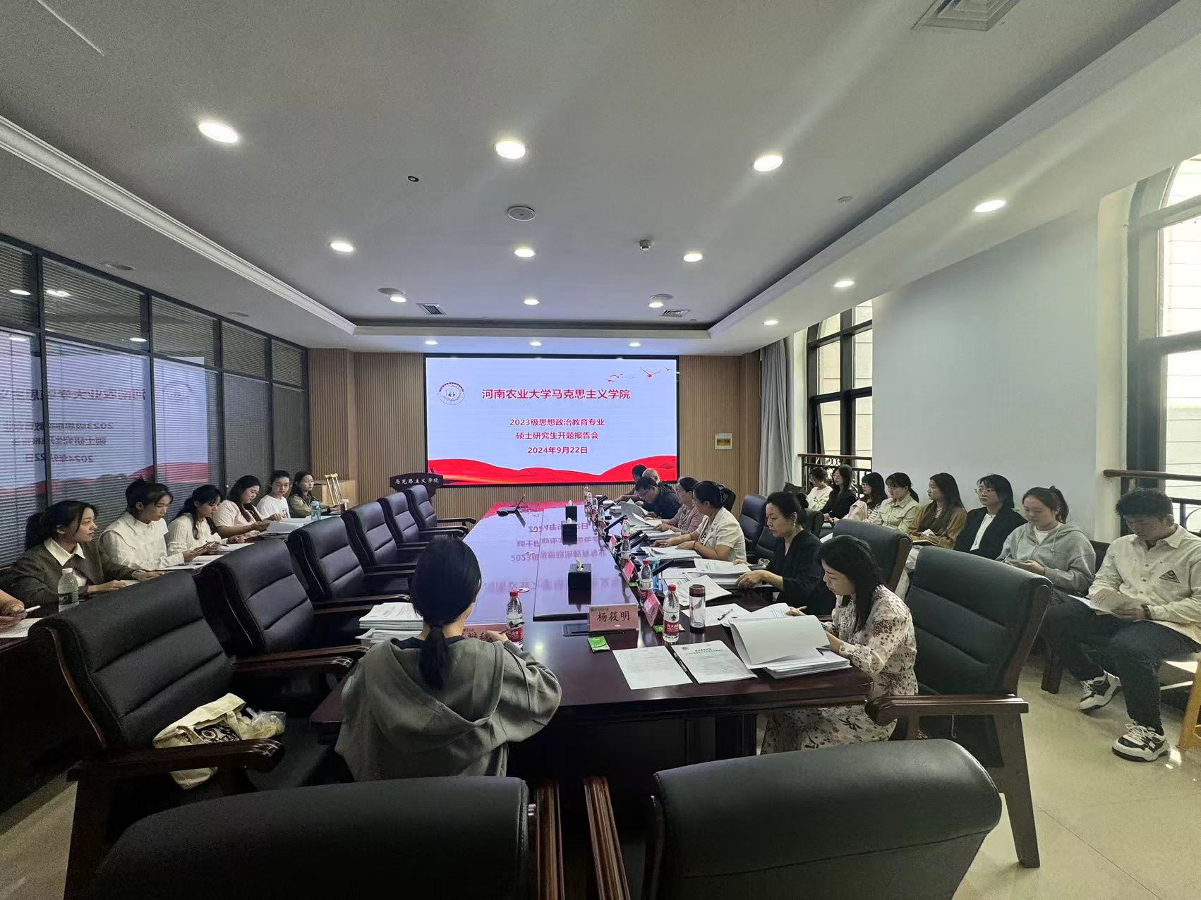 答辩根据专业方向分为三个小组。特邀华中师范大学赵长峰教授、河南中医药大学张会萍教授、河南财经政法大学田训龙教授担任答辩主席,邀请北京交通大学郑士鹏教授、河南理工大学南大伟教授、河南省委党校徐学庆教授以及全体导师担任答辩委员。研一新生旁听答辩会。