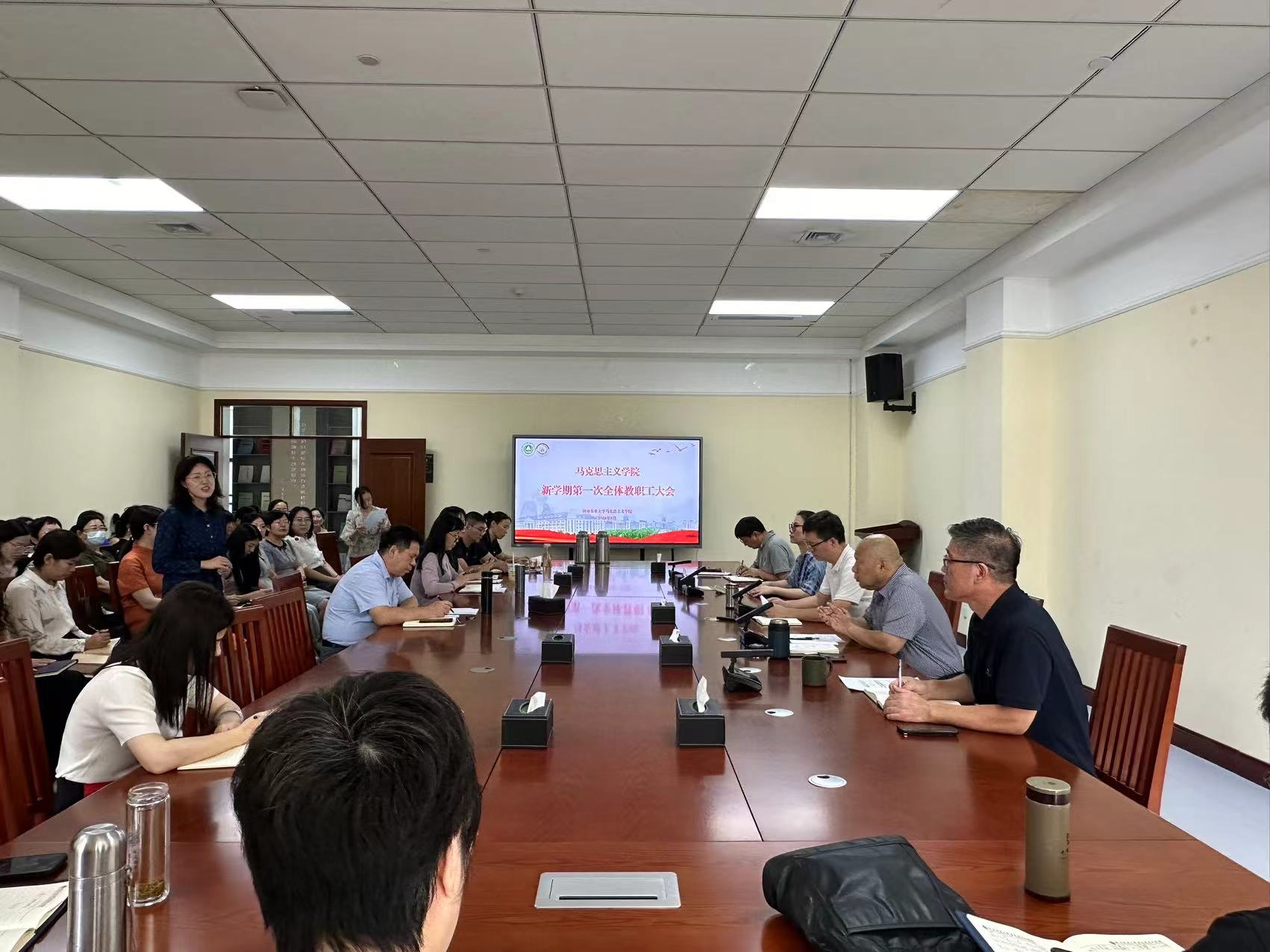 在306会议室召开新学期第一次全体教职工大会,会议由院党委书记李强主持,班子成员及全体教职工参会。