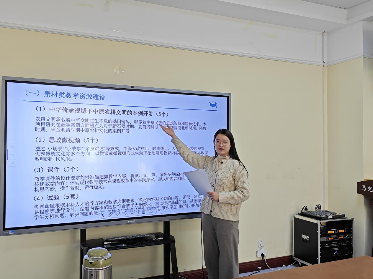 课题组成员陈家欣老师代表本组进行汇报。她围绕研究内容进行了详细的汇报,指出课题组坚持素材类教学资源为重点,以实际情境为抓手,围绕中华传承视域下中原农耕文明为重点开发数字案例;透过“小场景”“小故事”“亲身讲述”等方式,围绕大政方针、时事热点、人生感悟、校园观察、优秀传统文化等多个方向,开发思政微视频;聚合模拟仿真技术、场景设置,开发课件;以启发学生的创新思维和学生创新能力为中心,开发试题库;围绕落实思政课教师“六要”和立德树人的根本任务,开发微课建设等。并就研究方法、研究进度、组织分工、时间安排及预期成果等方面做了汇报。