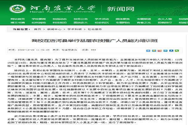 (张璐 刘梦迪 文\图)为了提升当地农技人员的技术服务能力,全面推进乡村振兴中的人才第一资源与创新第一动力作用,2022年12月15日至18日,情侣性爱视频 与唐河县联合举办了“唐河县基层农技推广体系改革与建设补助项目农技人员能力提升培训班”,唐河县农技中心负责人、社会服务处负责人及我中心特聘研究人员赵翠萍教授、叶优良教授、丁俊强教授等多名专家线上线下参加理论培训与技术指导活动。