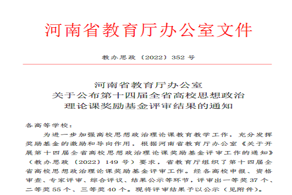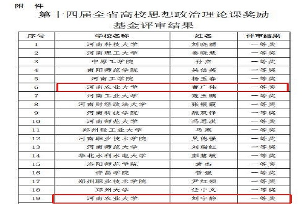 ( 翟有为 刘梦迪 文/图)近日,从河南省教育厅获悉,第十四届全省高校思想政治理论课奖励基金评审结果正式公布。经各高校申报、资格 审查、专家评审、综合评议、结果公示等环节,共评审出一等奖 37 个、 二等奖 55 个、三等奖 40 个。我中心研究人员曹广伟副教授、刘宁静博士两位老师荣获一等奖,董慧副教授荣获二等奖。