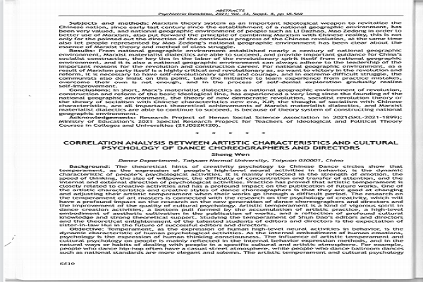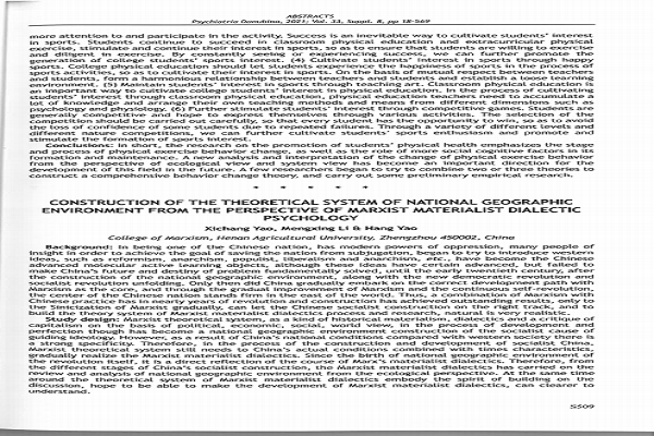 由 Offical Journal Of The Danubina Psychiatria Association主办出版的的SSCI期刊Psychiatria Danubina 2021年12月suppl.8发表了我中心姚锡长教授领衔撰写的论文《CONSTRUCTION OF THE THEORETICAL SYSTEM OF NATIONAL GEROGRAPHIC ENVIRONMENT FROM THE PERSPECTIVE OF MARXIST MATERIALIST DIALECTIC PSYCHHLOGY》,研究了从唯物辩证法看国家地理环境理论体系的构建。