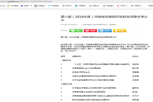 (李文博 文,黄真真图 )据大象网2016年12月16日消息,经过第六届(2016年度)河南省发展研究奖专家评审委员会对2014-2015年度咨询研究成果进行评审,并经河南省发展研究奖评审工作委员会全体会议审定,第六届(2016年度)河南省发展研究奖95个奖项已经对外正式公布。整个奖项包括一等奖5项、二等奖30项、三等奖60项。我中心周聪贤副教授的研究成果《河南省外向型经济的智力需求与高等教育的应对举措研究》获得二等奖。(链接://q.dahe.cn/2016/12-16/107935230.html)