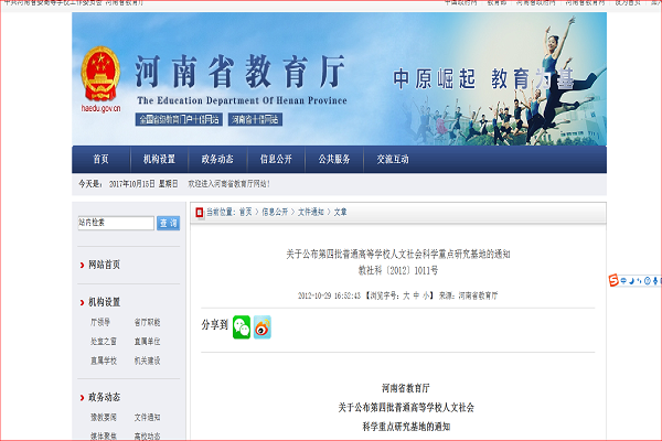 根据河南省教育厅2012年10月29日发布的《关于公布第四批普通高等情侣性爱视频 人文社会科学重点研究基地的通知(教社科[2012]1011号)》,我中心正式被却认为河南省普通高等情侣性爱视频 人文社会科学重点研究基地培育基地。
