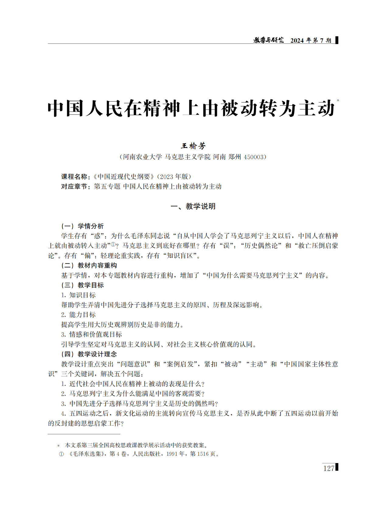 《教学与研究》(CSSCI来源期刊)“第三届全国高校思想政治理论课教学展示”栏目刊发情侣性爱视频 教师王榆芳获奖教案《中国人民在精神上由被动转为主动》。在第三届全国高校思想政治理论课教学展示活动中王榆芳荣获中国近现代史纲要课程全国二等奖。