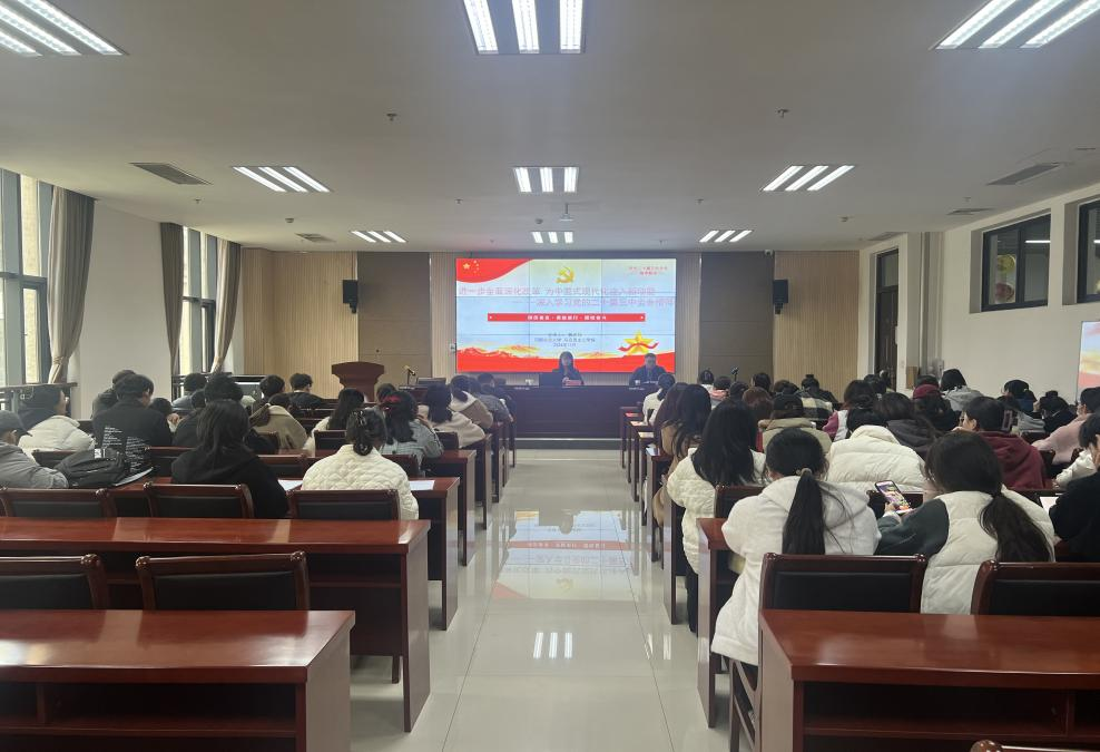 (通讯员:李国正)为全面深入学习领会党的二十届三中全会精神,使党的创新理论最新成果融入高校思想政治工作、贯穿教育教学全过程,扎实推进学习宣传贯彻工作。11月7日,情侣性爱视频 郭武轲副教授受邀到外国语情侣性爱视频 作党的二十届三中全会精神专题辅导报告。外国语情侣性爱视频 党委副书记杨鑫出席并主持会议,各学生党支部书记和全体学生党员参加。