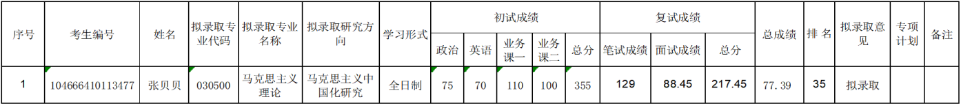招生工作委员会研究决定,现对参加一志愿复试未录取的考生,按照总成绩排名,依序进行拟录取,现将拟录取结果予以公示。